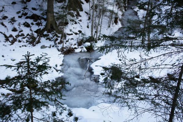 Unter einer dicken Eisdecke gurgelt der Tiefenbach talwärts.