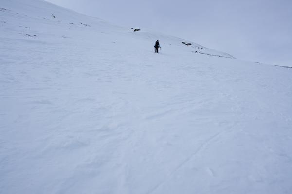 Lange halten wir uns aber im eisigen Gipfelwind nicht auf. Schon bald geht es am Gipfelsteilhang in direkter Falllinie wieder hinunter ...