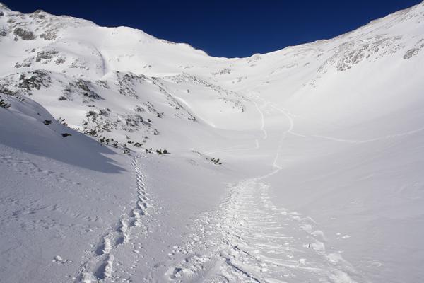 Am unteren Ausgang der "Langen Gasse", Schitourengeher müssen bei der Abfahrt über einen sanften Aufschwung herauf "bretteln".