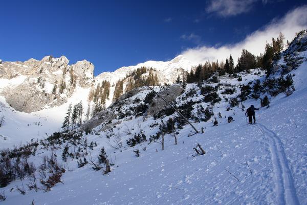Danach wird der Routenverlauf steiler, für geübte Schneeschuhwanderer aber ebenso wenig ein Problem, wie für die 3 Schitourengeher, die mich am Hang überholen.