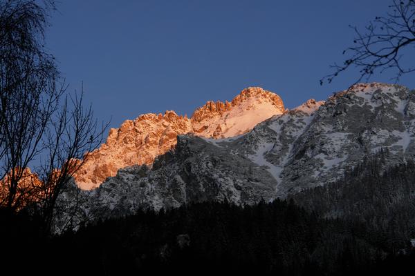 Start kurz nach Sonnenaufgang bei der Straßenkurve nahe dem Anstiegsweg auf den Säbelboden. Der Kammspitz zeigt sich an diesem herrlichen Morgen in bestem Licht.