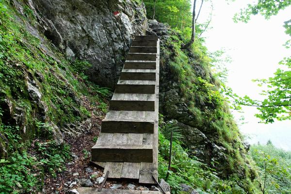 Einige Holzstege und eine Eisenleiter führen hinab ins Tal. Kurze, ausgesetzte Felsstellen werden teilweise mit Unterstützung von nicht sonderlich vertrauenserweckenden Drahtseilen zurückgelegt.