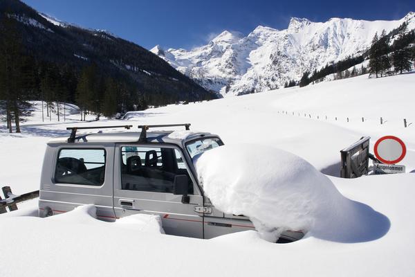 Winterschlaf. Ein "Geländewagen": Ein Wagen der sich in das Gelände einfügt. Es dürfte noch ein Zeiterl dauern, bis er wieder fahren kann.