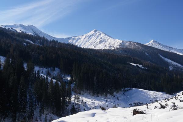 Mein Gipfelziel in Bildmitte - der Schusterstuhl - ist noch weit entfernt. Der Aufstieg wird über den Rücken auf der rechten Bergseite erfolgen. Links das Spateck, rechts das Säuleck.