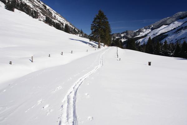... lege ich meine Spur in den tollen Pulverschnee. Einsinktiefe in tieferen Lagen etwa 5 cm, mit zunehmender Höhe sollten es bis zu 10 cm werden. Durch die Sonneneinstrahlung und die Fotopausen begannen die Schifelle unangenehm anzustollen.