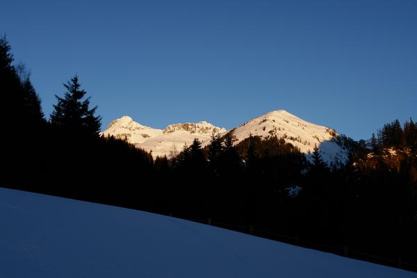 Start an der Straße von Zederhaus ins Riedingtal. Die sonnenbeschienenen Gipfel im Norden um das Mosermandl verheißen einen wunderbaren Schneeschuhwandertag.