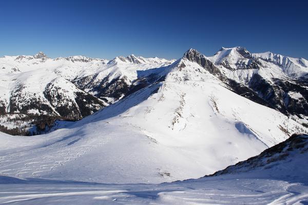| Nachdem sich der Gipfelbereich des Seeköpfl mit ca. 5 Schitourengehern "gefüllt" hat, folgen wir ihren Abfahrtsspuren - die Gröbnitzen vor Augen. Diesen Gipfel werden wir heute beim Abstieg überschreiten. |