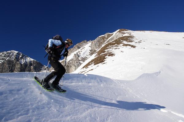 Der Schnee war in diesem Bereich aber hart gefroren. Mit den Zacken eines Schneeschuhes bleibt sie aber im Schnee hängen ...
