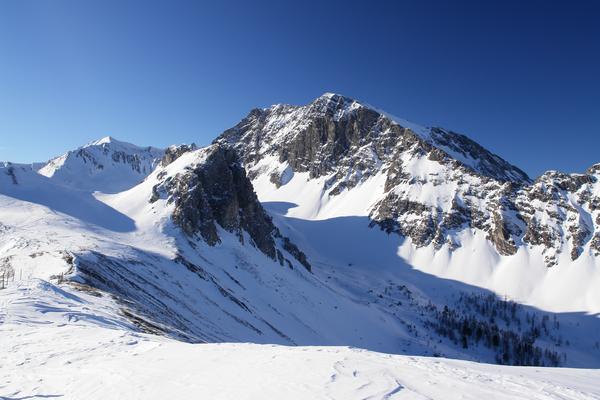 | Aufstehen geht und auch wenn jeder Schritt höllisch schmerzt, wollen wir den Abstieg versuchen. Für einen Blick auf die Schönheiten der Bergwelt bleibt jetzt allerdings kaum mehr Zeit. Wo werden Helmut und Bettina jetzt wohl sein. Noch auf der Felskarspitze (der Schneegipfel links) oder bereits am dominierenden Weißeck. Links der Bildmitte der dunkle Felsgipfel des Kempen. |