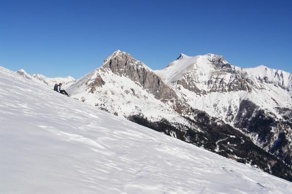 | Obwohl das Handy bereits ausgepackt und betriebsbereit war und ich schon einen guten Landeplatz für den Hubschrauber erkundete, wollten wir dann aber doch versuchen, den Abstieg auf eigener Kraft zu schaffen. Zunächst probiert es Ingrid am Hosenboden rutschend (links oben). Für das Panorama auf Zwillingwand und Guglspitzen im gegenüberliegenden Hochfeindkamm bleibt angesichts der Schmerzen aber kein Blick. |