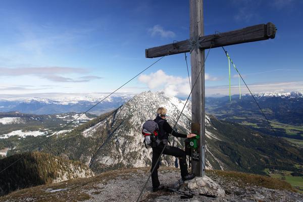 Beim Gipfelkreuz am Stoderzinken angelangt genießen wir den Ausblick ...