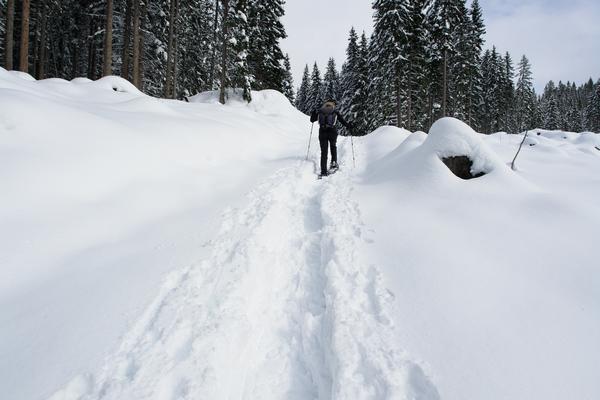 Oberhalb von etwa 1.300 Meter Seehöhe steigt die Schneemenge merkbar an. Dank zweier Schneeschuhgeher und einiger Wanderer ist die Route bis zur Viehbergalm aber gut gespurt.