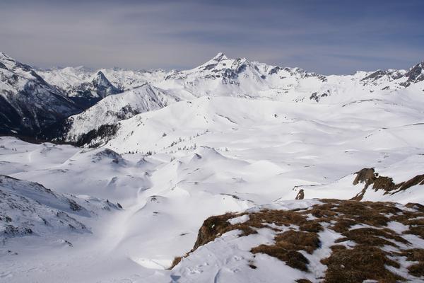 Ideales Schneeschuhgelände südlich der Stampferwand und westlich von Gebreinspitze und Labspitze über welches ich nun zu einer kleinen Hütte hinabwandern werde. In Bildmitte die Aignerhöhe, dahinter das Große Mosermandl.