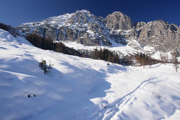 So beschränke ich mich halt auf das Bewundern der tollen Alpin-Szenerie sowie der vielen verschiedenartigen Spuren im Schnee auf den freien Wiesenhängen der Ardningalm.