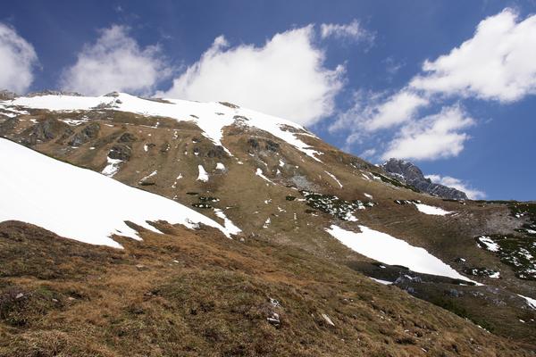 ... steigen wir weglos über die Almwiesen höher. Vor uns die im oberen Bereich schneebedeckte Grünspitze.