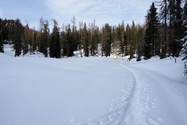 | Eigentlich wollten wir ja zur Schildenwangalm wandern, wegen des mühsamen Einsinkens im Schnee, vor allem aber aus Rücksicht auf Sammy, der immer häufiger seine Pfoten zu lecken begann, machten wir bei der Großen Wiesmahd wieder kehrt. Unsere Befürchtungen, Sammy könnte sich im teilweise harschigen Schnee verletzt haben, bewahrheiteten sich aber Gott sei Dank nicht. Er leckte und biss lediglich die Eisklumpen weg, die sich an seinen langen Haaren an den Beinen bildeten. Wir hätten doch einen "Anti-Stoll-Spray" mitnehmen sollen ;-). Beim Rückweg in den Autospuren ging es ihm aber schon wieder bestens. |