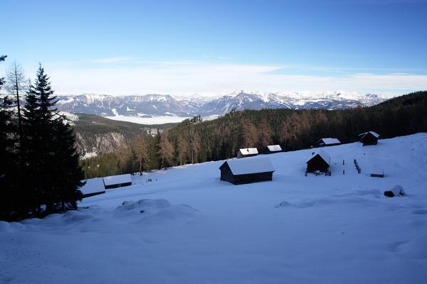 ... gelangen wir zur Berillenalm. Im Hintergrund das steirische Salzkammergut bei Bad Mitterndorf, überragt vom Toten Gebirge.