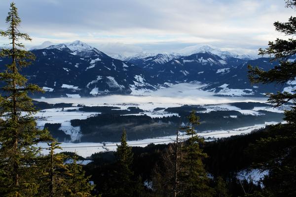 Während jetzt zumindest das von der B320 durchzogene Gebiet nördlich vom Mitterberg nebelfrei wurde, würde er sich drüben im Ennstal im Gebiet um Stein an der Enns heute wohl nicht mehr verziehen.