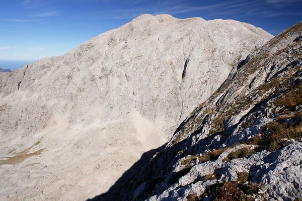 Mächtig zeigt sich der Hohe Göll. Auf einem Schotterfeld unterhalb der Bildmitte ...