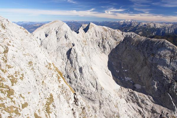 | Durch einen rutschigen Kamin führt mich der Weg kurz vor dem Ziel ein kleines Stück bergab. Der markierte Wanderweg würde um den Archenkopf westseitig herumführen (mein Rückweg) - ich steige nun aber weglos über einige kurze, harmlose Kletterstellen auf den Großen Archenkopf. Von hier überblicke ich den nur selten begangenen Kuchlerkamm, der sich nach Osten bis zum Kleinen Göll zieht. |