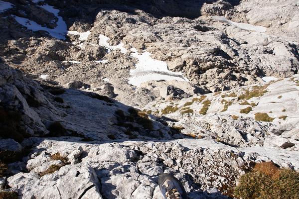 Unter mir huschen immer wieder Absteiger vom Hohen Göll über ein Schneefeld - schwarze Spuren hinterlassend - Richtung Hohes Brett.