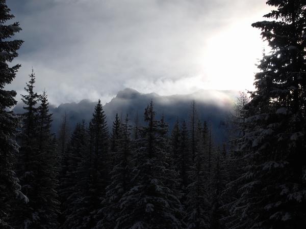 Die Sonne taucht den nebelverhangenen Kammspitz in ein mystisches Licht.