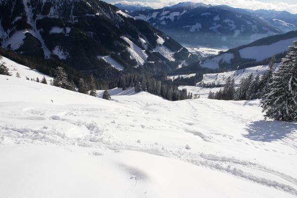 | Während er wieder nordwärts auf meist gutem Pulverschnee abfährt, stapfe ich südwärts am überwiegend feuchten und patzigen Schnee Richtung Ardningalm, wo ich noch vor wenigen Tagen mit Krücken herum gestapft bin. |