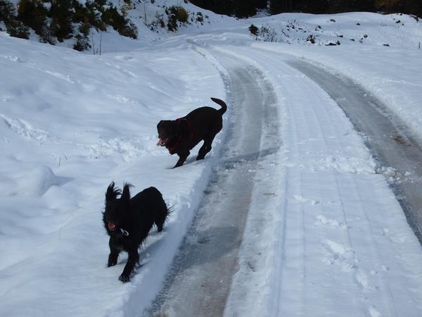 | Das gehört natürlich bestraft. Aber erst einmal erwischen, lautet die Devise. Der leichtfüßige, wendige, quirrlige, schlitzohrige Lauser und Dauerläufer Sammy hat da mit dem weniger flexiblen Kraftpaket Nico leichtes Spiel. Dieser "rächt" sich dann dafür beim Kopf-an-Kopf-Rennen mit dem bei Labradoren so beliebten "Aus-der-Spur-Rempeln", was Sammy wieder mit Bellen und Zwicken quittiert. |
