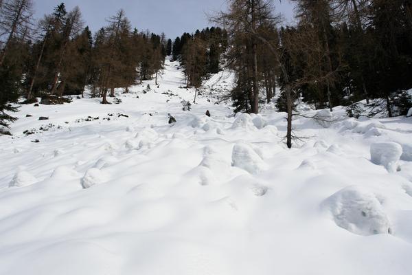 ... und über den von Lawinenkegeln gezeichneten Forstweg ...