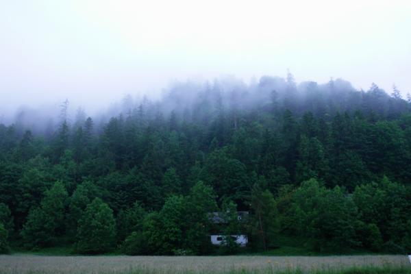 Nebelschwaden legen sich an die Waldhänge neben der Traun.