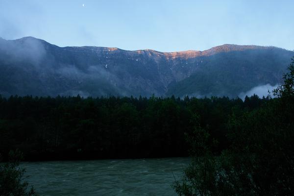 Hoch über mir wird der Bergkamm, den ich heute überschreiten möchte, bereits von der Morgensonne gekitzelt.