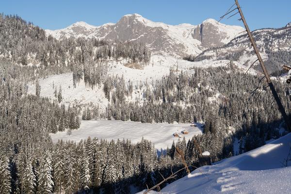 Der herrliche Tiefblick zur Salzaalm zeigt mir gleich ein weiteres potentielles Schneeschuh-Ziel.