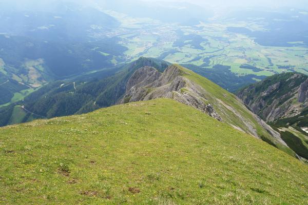 Hinter mir steigt ein weiterer Wanderer am Grasrücken hoch, nachdem er die Steilflanke im rechten Bildbereich hinter sich gebracht hat.