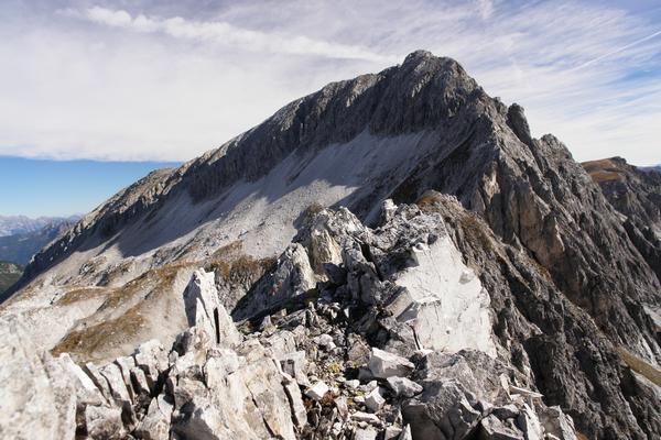 | Irgendwie - obwohl ich unterwegs schon 3 Mal aufgeben wollte - habe ich es dann aber doch noch geschafft, den Gipfel über einen rutschigen Kamin und über brüchigen Fels zu erreichen. Im Osten lockt die Permuthwand, die sich nach Norden (links) mit der Rießlwand fortsetzt. |