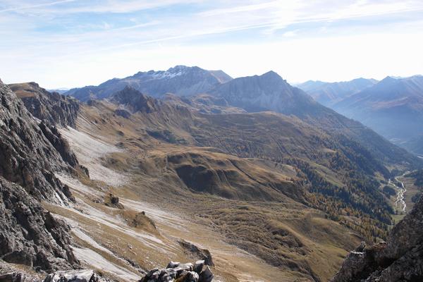 | Im Süden überblicke ich das Wiesengelände zischen Muhreralm, Aignerhöhe und Labspitze, welches ich bereits 2 Mal im Winter - einmal mit Tourenschi und einmal mit Schneeschuhen - beschritten habe. Im Hintergrund der Hochfeindkamm mit den Guglspitzen und der Zwillingwand, die ich im vorjährigen Sommer besucht habe. |