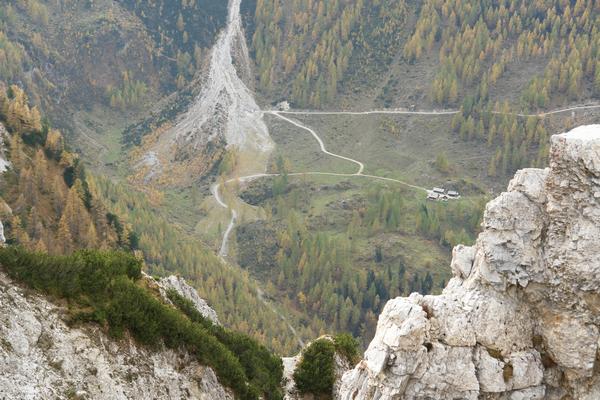 Blick hinab zur Ursprungalm. Nicht zu verwechseln mit der gleichnamigen Alm in den Schladminger Tauern, über welche man zu den Giglachseen hinauf gelangt.