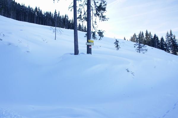 Vorbei an der lediglich von einem Tier gespurten Forstwegabwzeigung zur Unteren Neudeckalm, von der wir am Nachmittag wieder herüber kommen werden.