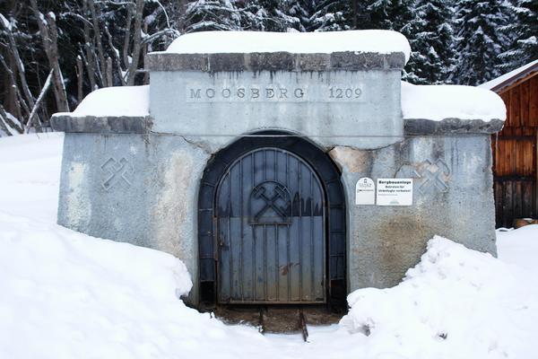 Über die geräumte Schneefahrbahn komme ich an den historischen Salzbergwerksstollen vorbei.