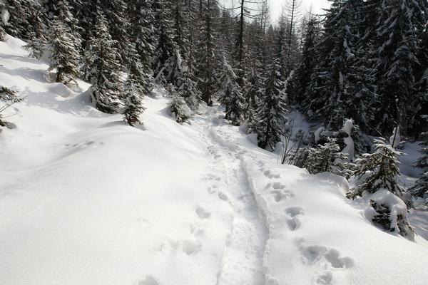 Von der Vordersandlingalm geht´s nun im Wald Richtung Lupitsch zurück. Zahlreiche Schneeschuhspuren zeigen die zunehmende Beliebtheit dieser Winter-Fortbewegungsmöglichkeit.