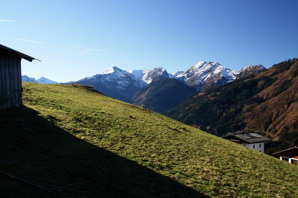 Blick über den Großarlgraben auf die bereits zu den Hohen Tauern zählende Ankogelgruppe. Die höheren Gipfel zeigen sich - wie auch in den zu den Niederen Tauern zählenden Radstädter Tauern - schneebedeckt.