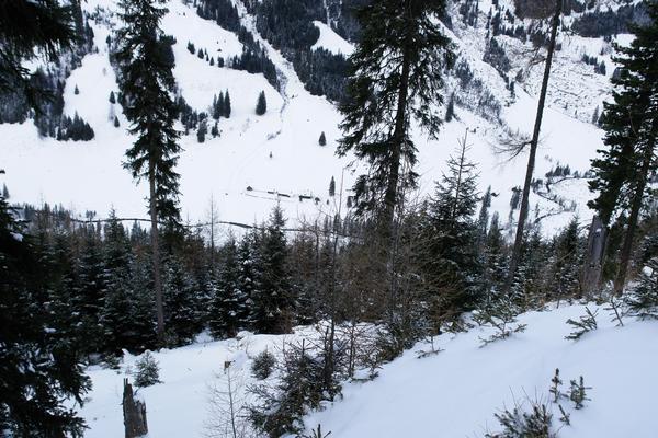 Von der Schneetalalm folgen wir dem Forstweg talwärts. Tiefblick zu den Sattentalalmen.