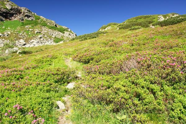Nach dem Flachstück geht es nun stetig, aber nie schwierig, bergwärts. Durch blühende Almrauschfelder ...