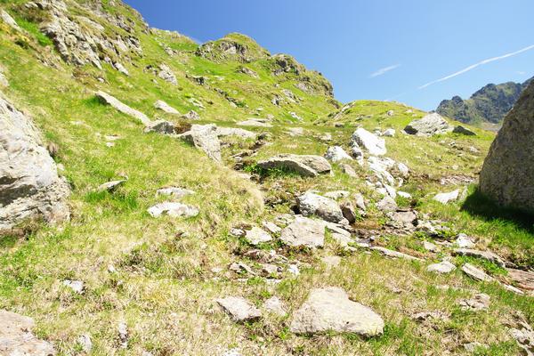 Hat sich die Südflanke aus der Ferne als Steilhang dargestellt, bietet sie vor Ort immer wieder unschwierige und recht flache Terassenstufen.
