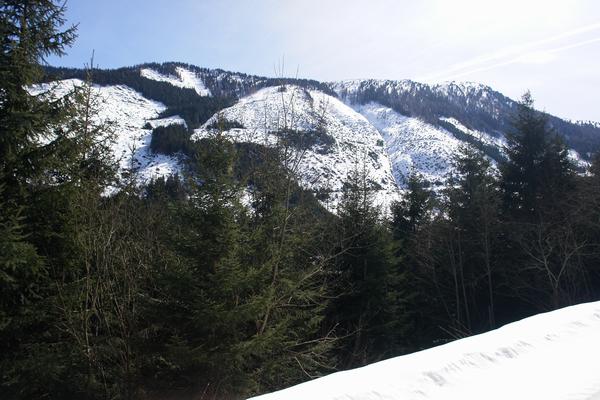 Blick auf die kahlen Waldhänge, deren einstiger Bewuchs vor Jahren schon dem Föhnsturm zum Opfer gefallen ist.
