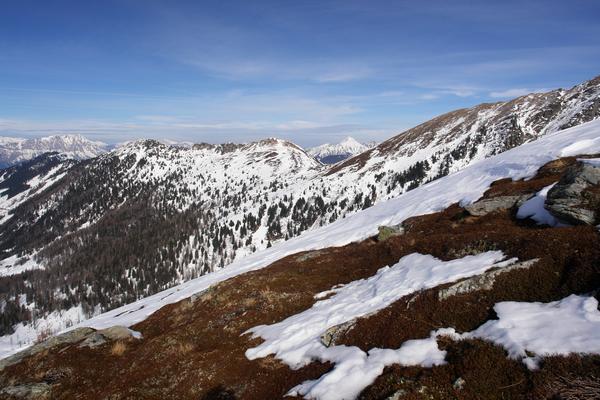Blick vom abgeblasenen Rücken Richtung Osten auf den Bergrücken vom Kochofen über den Dromeisspitz im Spateck. Im Hintergrund die Schneepyramide ...