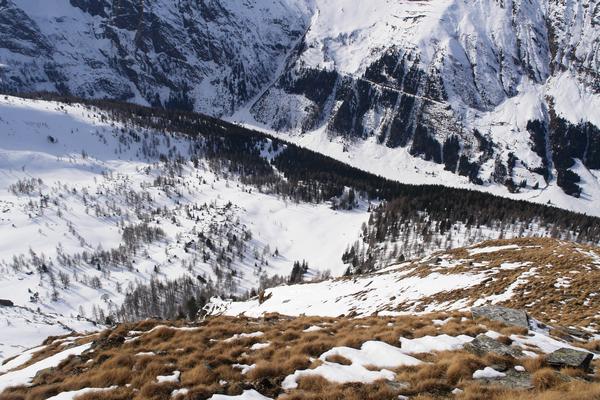 Nach kurzer Gipfelrast am Schusterstuhl mache ich mich am aperen Nordrücken wieder auf den Rückweg zur Schneetalalm (Bildmitte). Eine weitere Etage darunter das Almgebiet im Sattental.