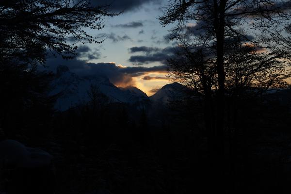 | Start im Lammertal in Annaberg-Lungötz in der Nähe eines Schiliftes noch vor Sonnenaufgang. Den ersten Abschnitt über die Straße und Forstwege habe ich demzufolge mit Stirnlampe zurückgelegt. Ein kurzer Verhauer (ich zweigte bei einer Forstraßengabelung nicht nach rechts bzw. geradeaus ab) ist meiner schläfrigen Unkonzentriertheit zuzuschreiben, aber auch der Tatsache, dass es sich auf den 1 bis 3 Zentimeter frischen Pulverschnee auf der ansonsten geräumten Fahrbahn so angenehm gehen ließ. |