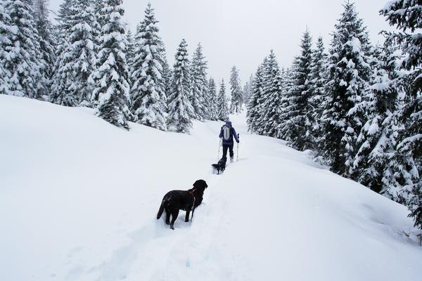 | Da wir heute zum ersten Mal mit den Hunden in so tiefem Neuschnee unterwegs waren, konnten wir ihr mitleiderregendes Gehabe (vor allem jenes von Sammy) noch nicht richtig deuten. Bei Folgewanderungen - auch wesentlich längeren - stellte sich aber heraus, dass spätestens beim Abstieg sämtliche Wehleidigkeit bei den beiden verschwunden war und sie lebhaft wie eh und je herumtollten. |