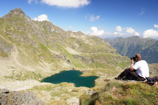 ... in dem wir unseren eigenen - äußerst aussichtsreichen - Jausenplatz einrichten. Zu unseren Füßen im Wildkar der Obere Wildkarsee.