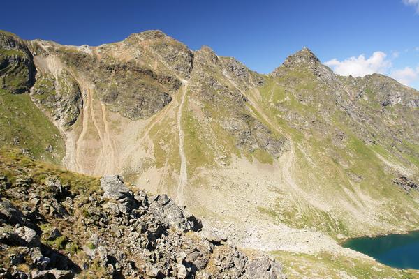 ... zur Wasserfallspitze (links) zieht. Leicht rechts der Bildmitte unser späteres Aufstiegsgebiet hinauf in die Scharte, welche auf der rechten Seite durch den Hinteren Wildkarstein begrenzt wird.